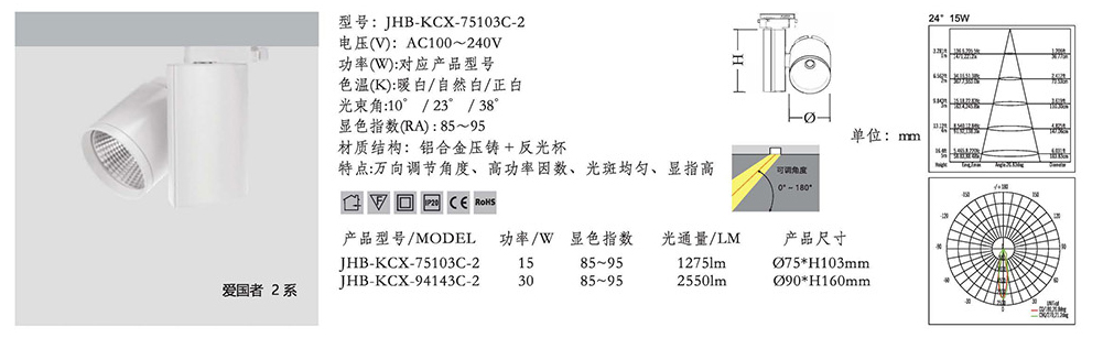 - 型 号 : JHB-KCX75103C-2 输入电压:AC 100V-240V 显指:85~95 功率:对应产品型号 色温:暖白/自然白/正白 光束角:10°/23°/38°