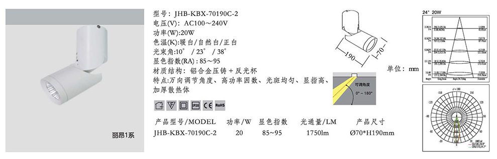 • 型 号 :  JHB-KBX-70190C-2 输入电压:AC 100V-240V 显指:85~95 功率:20W 色温:暖白/自然白/正白 光束角:10°/23°/38°