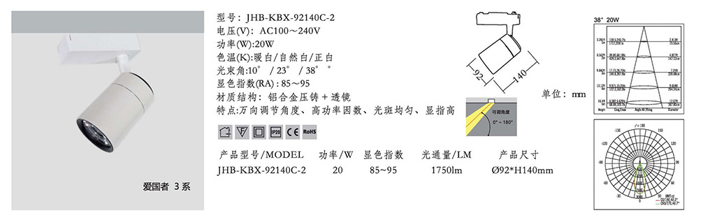 - 型 号 : JHB-KBX-92140C-2 输入电压:AC 100V-240V 显指:85~95 功率:20W 色温:暖白/自然白/正白 光束角:10°/23°/38°