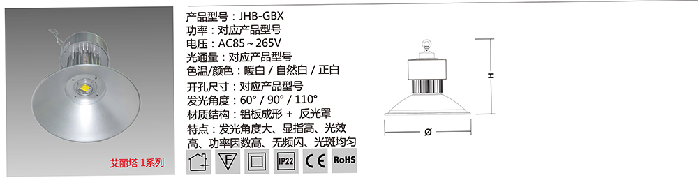 | 使用范围:工厂,车间 ,仓库等。 | 产品特点:进口航空铝材,阳极氧化磨砂工艺,降低光损。一体加厚纯铝+对流设计解决散热问题,保障光源寿命,高透光率透镜,透光率高达95%以上光线均匀,防尘防辐射。 | ||||||||