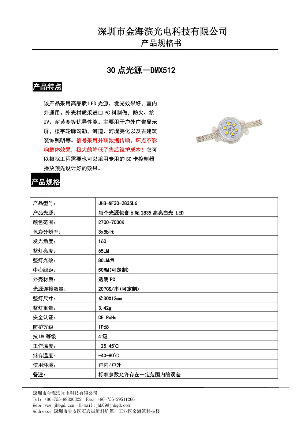 - 型号:JHB-NF30-2835L6 输入电压:DC24V 颜色范围:2700-7000k 色彩分辨率:3*8bit 功率因数:≥0.5 质保:3年 防护等级:IP68