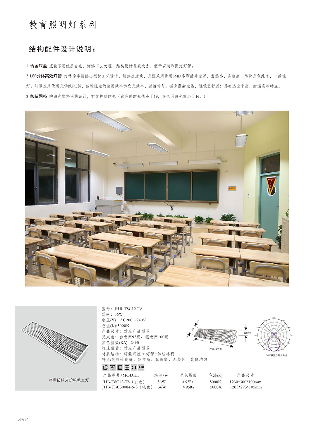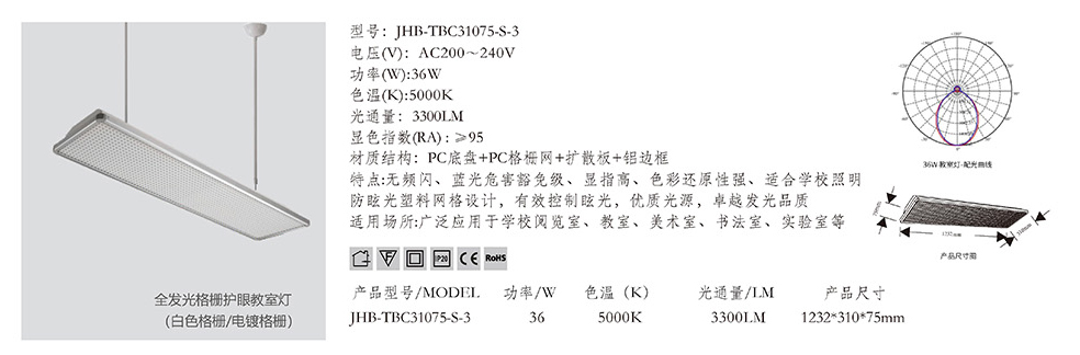 - 型号:JHB-T8C12-TS 功率:36W 电压(V):AC200~240V 色温(K):5000K 产品尺寸:对应产品型号 光束角:白色网93度、银色网100度 显色指数(Ra):≥95 灯珠数量:对应产品型号 材质结构:灯盘底座+灯管+防眩格栅 特点:散热性能好、显指高、光效高、无频闪、光斑均匀