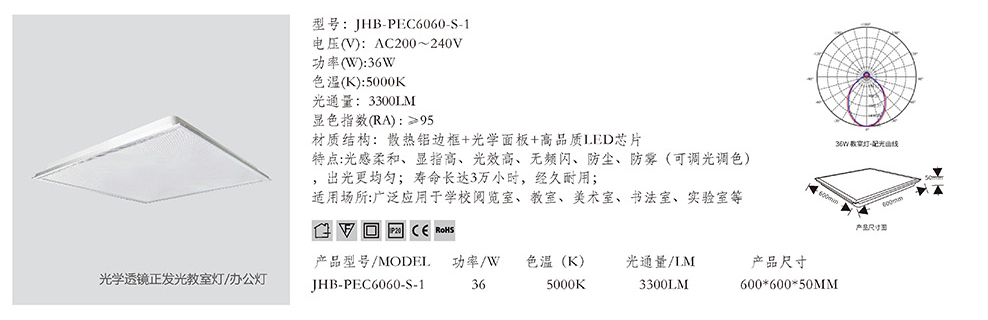 - 型号:JHB-PEC6060-S-1 功率:36W 电压:AC200~240V 色温:5000K 显色指数(Ra):≥95