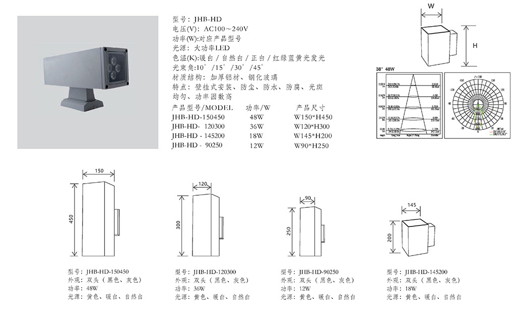 - 型号:JHB-HD 功率:对应产品型号 电压:AC100~240V 色温:暖白/自然白/正白/RGB 光束角:10°/15°/30°/45°